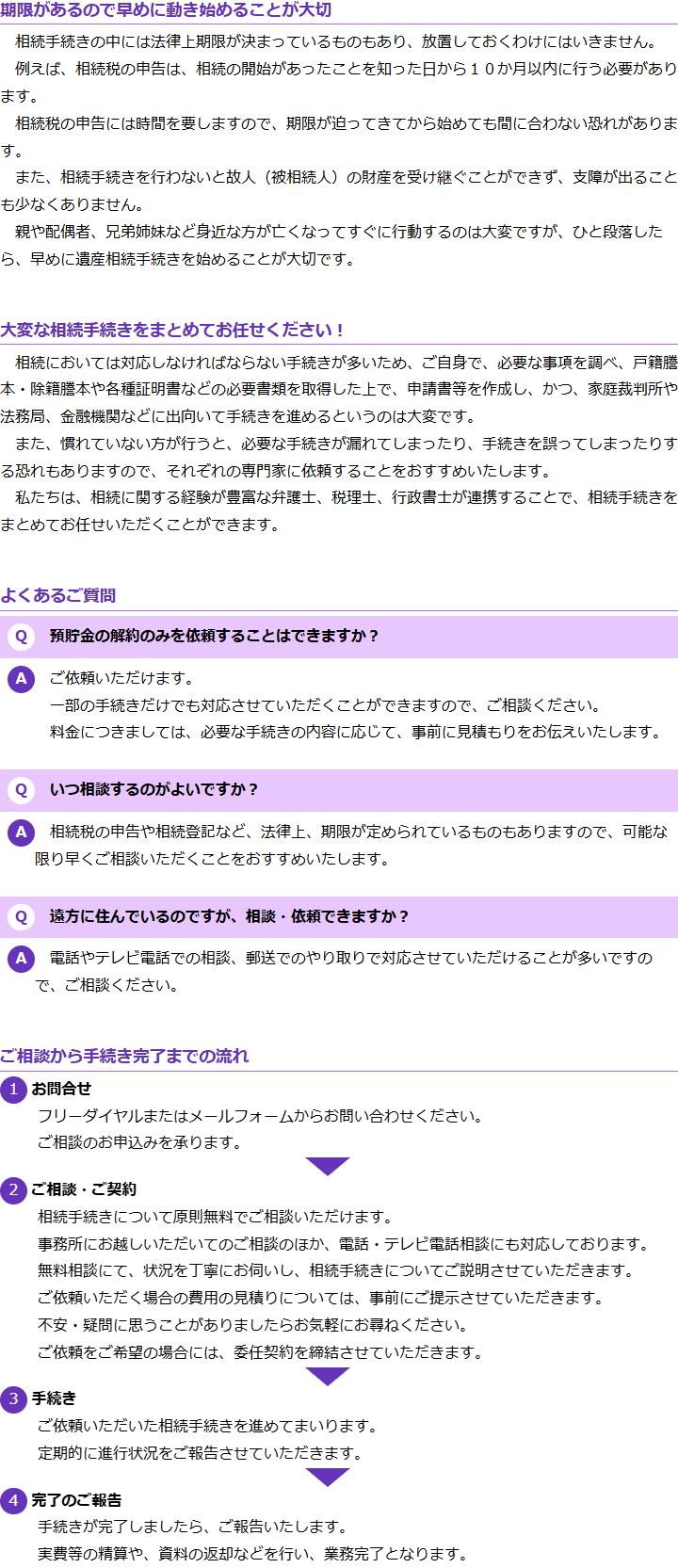 相続登記を行う場合は、管轄する法務局によって取り扱いが異なるものもありますので、その手続きを行う法務局に慣れている、その法務局所在地で主に活動を行っている専門家に依頼される方が手続きをスムーズに進めることができる場合が多いです。